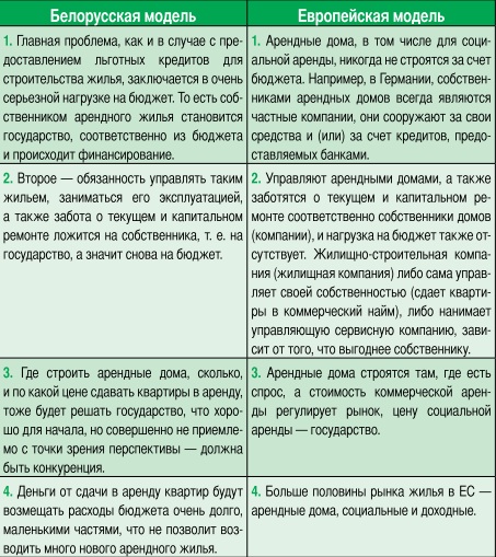 Сама идея – увеличение доли арендного жилья по отношению к жилью, находящемуся в собственности граждан – правильная, хоть и запоздалая. Но при этом планируется, что государство будет строить арендные дома за счет средств бюджета. Вот с этим решением можно поспорить. Сразу оговорюсь, что предложенная модель является чисто белорусской, в странах ЕС проблема решается совершенно иначе. И удобнее всего сравнить два варианта на примерах (таблица ниже). При этом цивилизованный рынок арендного жилья предполагает совсем иные отношения между нанимателем и наймодателем, нежели существующие сегодня в Беларуси. Действующие в Беларуси договоры найма по сути формальны, и заключаются, проще говоря, для налоговой и регистрации. А классическая аренда в первую очередь подразумевает бессрочность: в арендованной квартире при желании вы можете жить всю жизнь. Права арендатора защищены даже больше, нежели собственника.