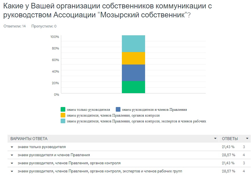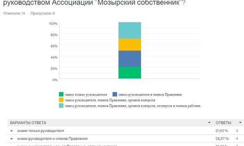 Геннадий Калёнов познакомил участников с результатами опроса членов Ассоциации "Мозырский собственник" (40 ответов на 10 вопросов). После этого состоялось обсуждение возможных дополнений в Стратегию развития Ассоциации «Мозырский собственник», связанных с разработкой антикризисных мероприятий.