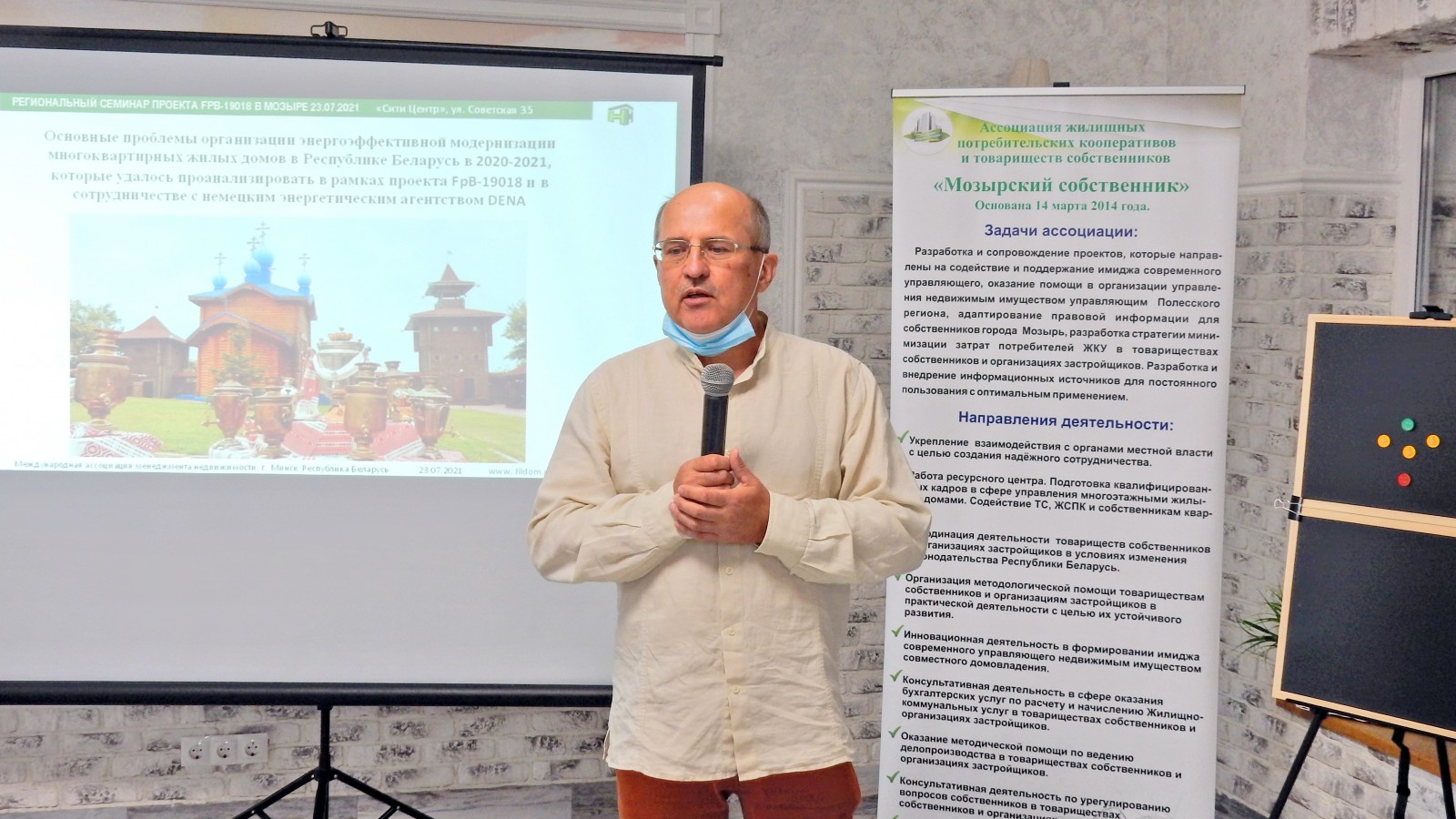 Открыли мероприятие Наталия Покотило (председатель правления Ассоциации «Мозырский собственник») и Алег Сиваграков (эксперт проекта, доцент кафедры экономики и управления Института предпринимательской деятельности. Они также познакомили участников с проектом FpB-19018 «Разработка инструментов взаимодействия и межотраслевого сотрудничества для профессионального управления недвижимостью» и его первыми результатами.